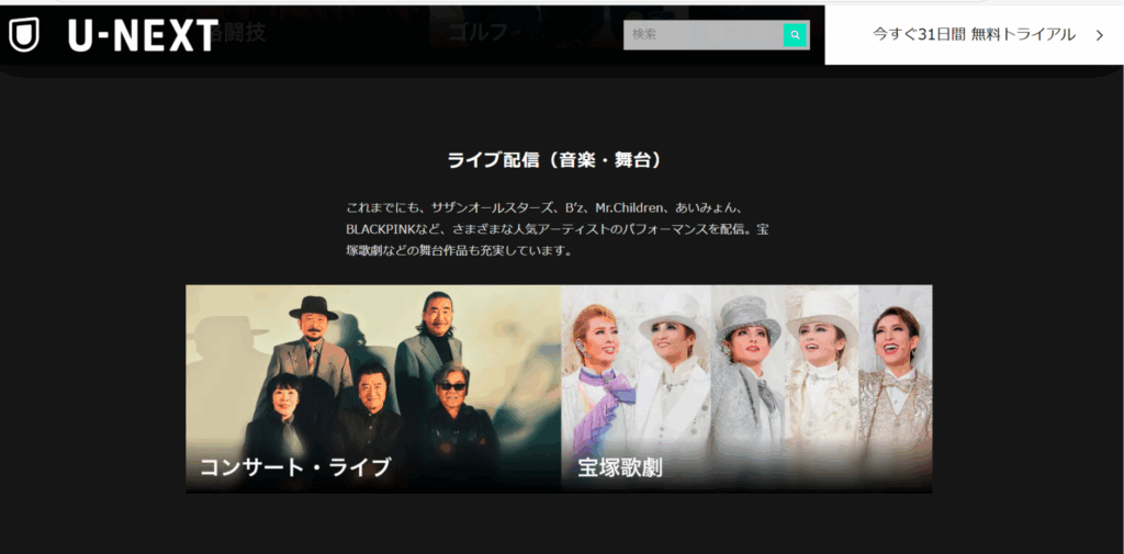 - U-NEXTは映画やドラマだけでなく、格闘技・サッカー・舞台・音楽ライブなどの配信もカバー。
