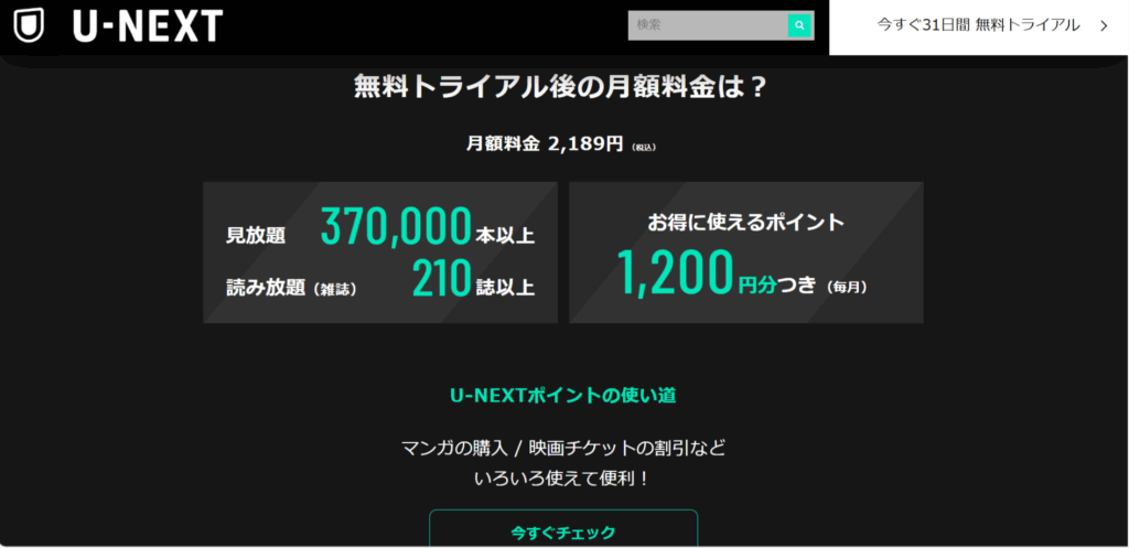 U-NEXTの月額料金には毎月1,200ポイントが含まれており、新作映画やマンガ購入、映画館チケット割引、PPV購入などに利用可能です。実質的に “自己負担額を抑えながら最新作を楽しめる” 仕組みになっており、他の定額制サービスにはない大きな魅力です。