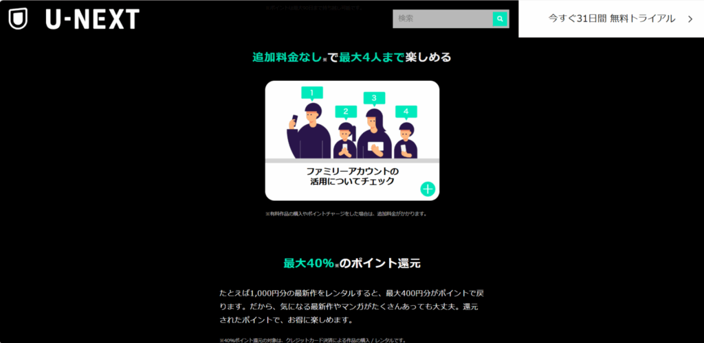 ※料金を他サービス(Netflix、Amazon Prime Videoなど)と比べると割高に見えますが、ポイント付与やコンテンツの幅広さ、同時視聴数の割合(家族4人で共有できる)等を考えるとコスパは十分高いと言えます。