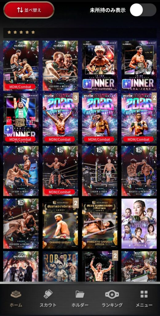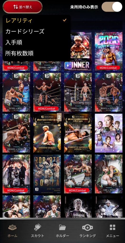 左上部の【並べ替え】や右上部の【未所持のみ表示】でホルダー内の表示方法を変更することができます