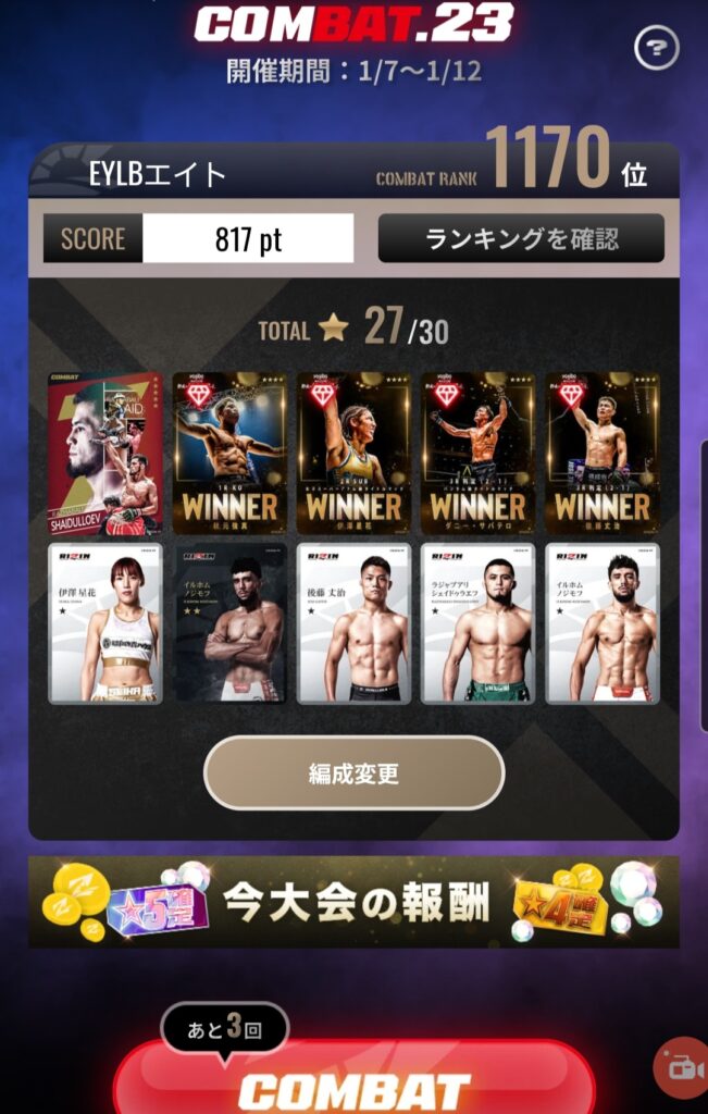 - COMBAT.10で上位200位の限定報酬カードの入手に失敗し、本格的にCOMBAT攻略に着手