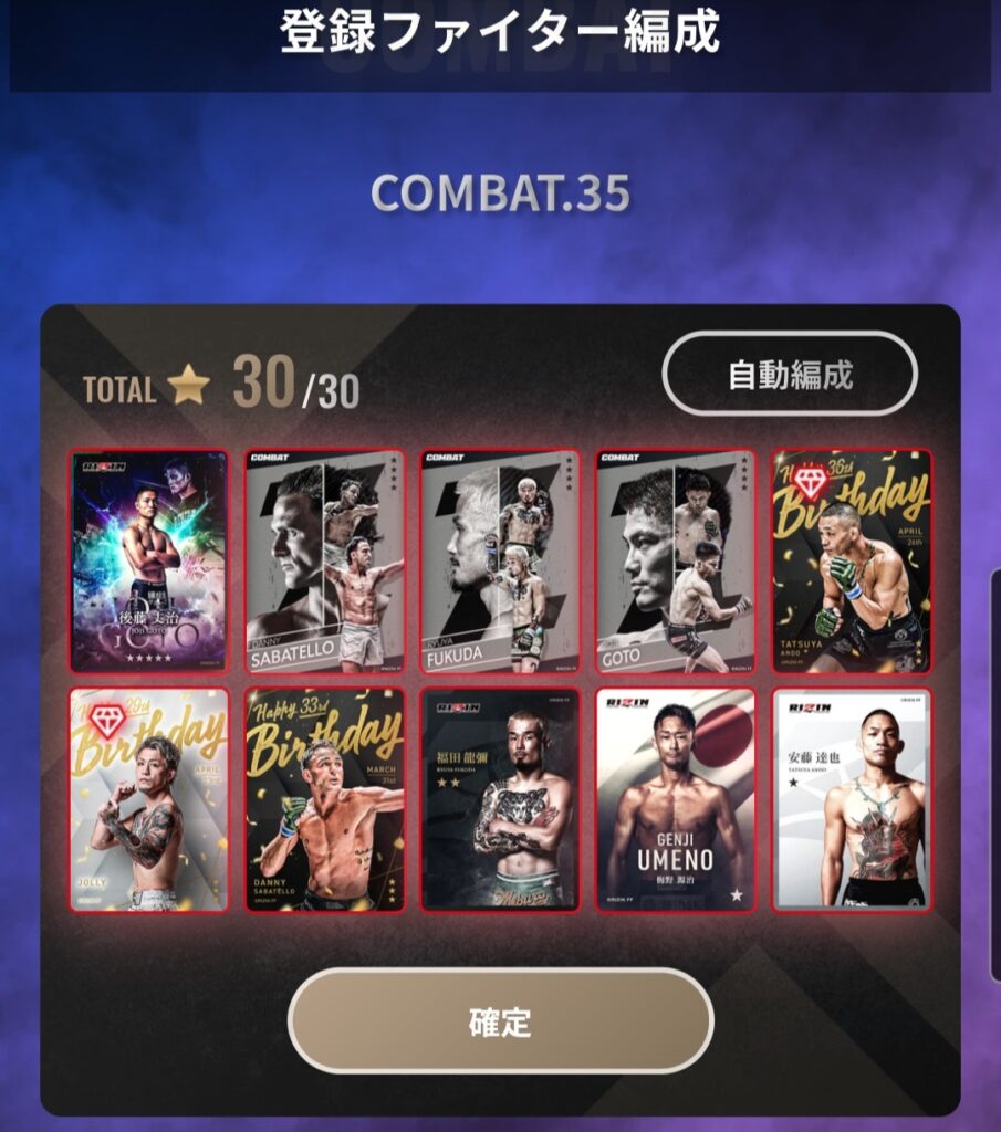 今回はカード編成に苦戦するユーザーが出ることが想定されるので、55311で確実に3勝狙える布陣と33333で全勝5-0を狙える布陣をメインに5枚編成を組んでいくことも考えたが、★4後藤、サバテロ、安藤、福田の保有率は高いと思うので、33333で全勝5-0は中々厳しそうと判断し、オールマイティ編成で戦うことに