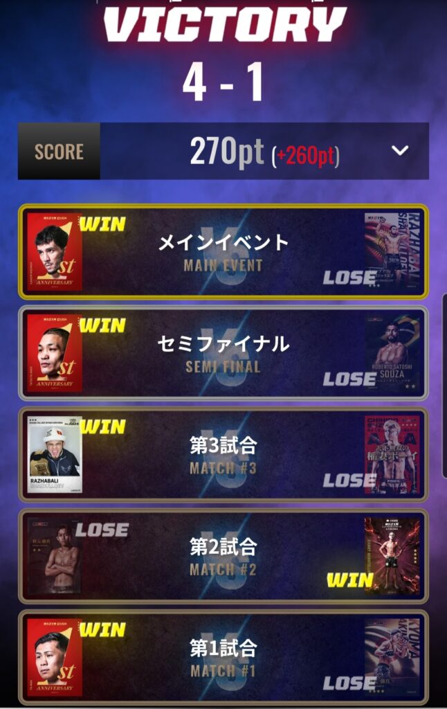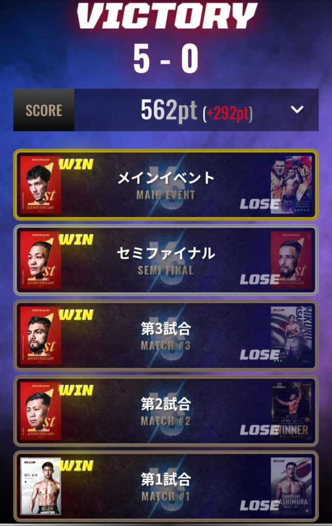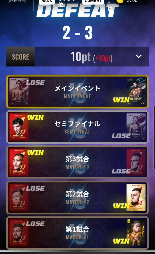 - COMBAT.23、24、27、32、34大会で全勝フィニッシュ